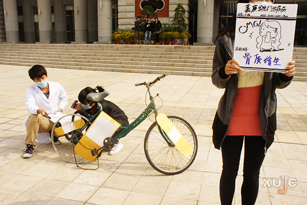 小綠,巨型OK繃,穿白大褂的醫(yī)生,這是在排練話劇嗎?不,這是院團委主辦的“定格快閃show小綠”公益活動。12月3日11時40分,在主樓群三號樓圖書館門前,來自院學(xué)生會的26名志愿者們用他們獨特新奇的“定格快閃”時尚新方式,呼吁大家共同愛護小綠。