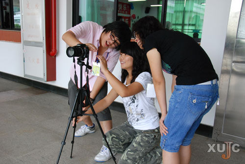 記者一走進(jìn)新聞傳播系的展廳,就發(fā)現(xiàn)一個(gè)新穎的“體驗(yàn)區(qū)”??忌鷤?cè)谥驹刚叩膸椭驴梢宰杂傻夭僮鲾?shù)碼攝像機(jī)和單反數(shù)碼相機(jī),體驗(yàn)拍攝的樂趣。