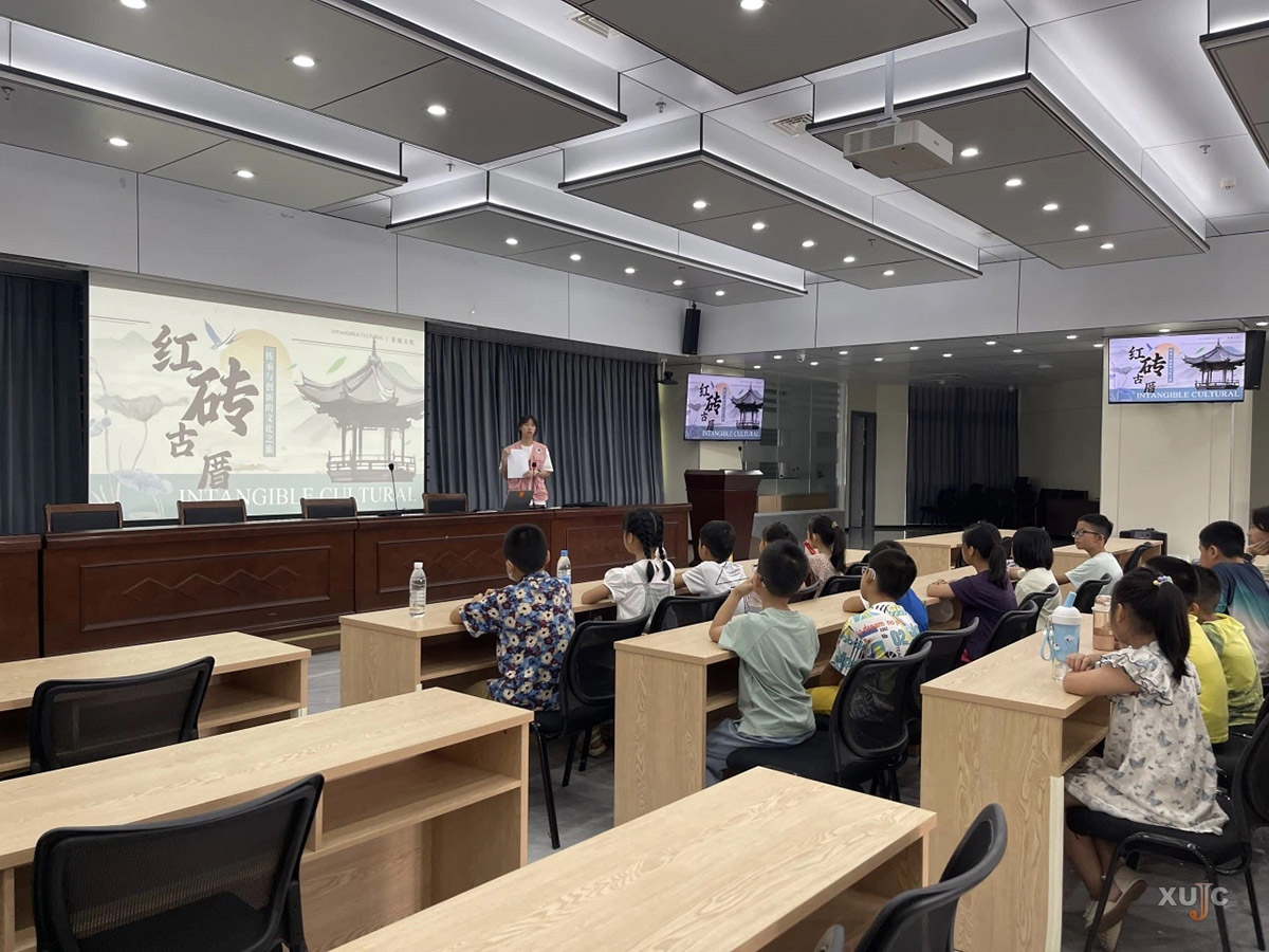 7月12日,在古厝建筑美學(xué)啟蒙課程中,實(shí)踐隊(duì)員以動畫《古厝的秘密》和“臭頭皇后”傳說導(dǎo)入,借助紅磚古厝模型、建筑解構(gòu)PPT,向孩子們生動解析“燕尾脊”“出磚入石”等技藝的文化寓意。在互動問答環(huán)節(jié),孩子們辨析祖祠與民居功能,從“南洋錢,唐山福”諺語感悟閩南人重祖敬宗的精神內(nèi)核。這一環(huán)節(jié)旨在揭開古厝的神秘面紗,讓孩子們直觀感受其建筑之美與歷史厚重,理解其作為文化載體的核心價(jià)值。