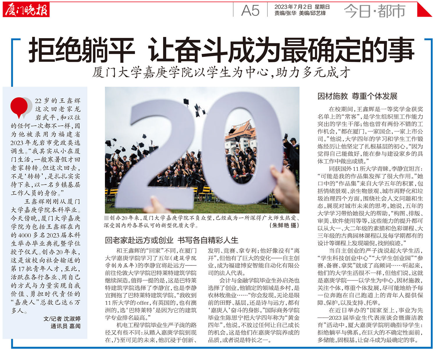 王鑫輝剛剛從廈門大學(xué)嘉庚學(xué)院本科畢業(yè)。今天傍晚,廈門大學(xué)嘉庚學(xué)院為包括王鑫輝在內(nèi)的4000多名2023屆本科生舉辦畢業(yè)典禮暨學(xué)位授予儀式。創(chuàng)辦20年來(lái),這是該校向社會(huì)輸送的第17批青年人才,至此,活躍在各行各業(yè)、用自己的方式與力量實(shí)現(xiàn)自我價(jià)值、勇?lián)鷷r(shí)代責(zé)任的 “嘉庚人”總數(shù)已達(dá)6萬(wàn)多人。