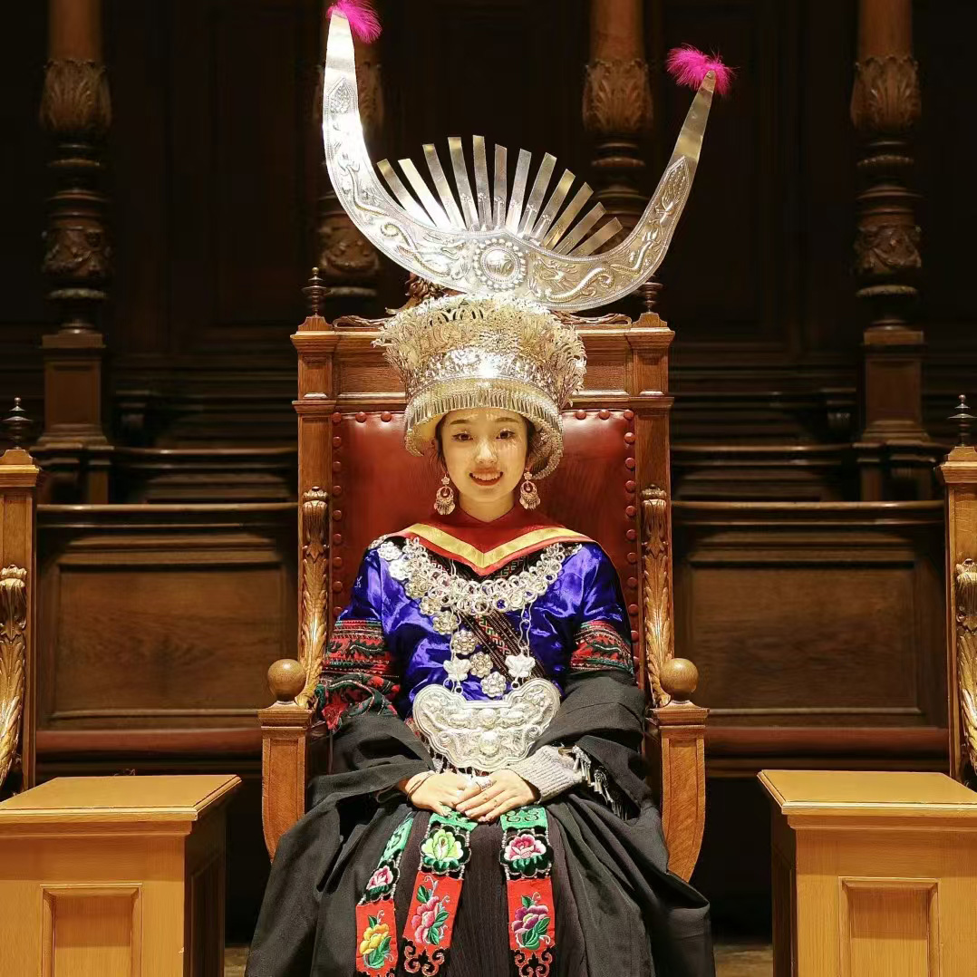 余天羽的社交媒體還發(fā)布了一張她坐在畢業(yè)典禮交椅上的照片,她說(shuō),這是自己因?yàn)?ldquo;民族高定(服飾)”獲得了特別福利——畢業(yè)典禮完成后,校方請(qǐng)她再次入場(chǎng),“快坐到交椅上,我們重新開(kāi)燈,給你拍攝!”于是,這位中國(guó)女孩坐上那把莊重的交椅。