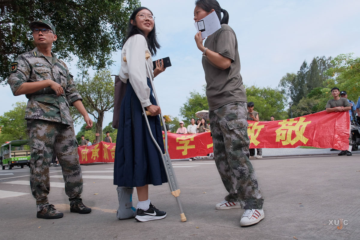 在送行的人群中,有一位新生拄著拐杖前來。盡管腳踝扭傷帶來的疼痛讓她步履維艱,但她依然堅持著,想要為教官們送上一份祝福。