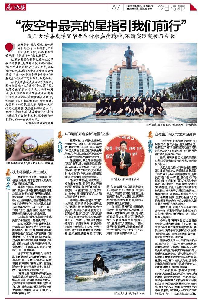 蒼穹下的“陳嘉庚星”,指引著所有嘉庚學(xué)院人傳承嘉庚精神,自強不息,止于至善,服務(wù)社會,報效祖國。校園里的“嘉庚之星”,更是激勵著一批批學(xué)子勇敢追夢、奮勇拼搏,讓青春在奮斗中綻放光芒。