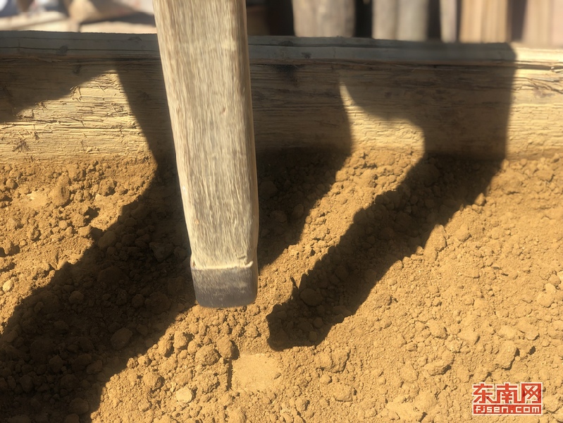 用木棒擊實生土是土樓夯筑的重要工序之一。江峰 攝