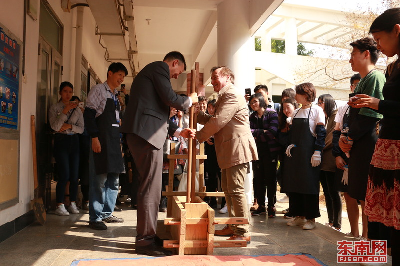去年,在廈大嘉庚學院舉辦的閩南傳統(tǒng)建造技藝研討會中,來賓體驗土樓夯土。劉可鑫 攝