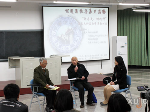 林其泉老教授向同學(xué)們介紹了抗戰(zhàn)時期帶領(lǐng)全校師生在閩西山城長汀發(fā)憤圖強的校長薩本棟。林其泉老教授說,那時候的條件真是太苦了。宿舍、教室、圖書館、教學(xué)中心都得在廟里。沒有蔬菜,只好自己種;蚊子多,只能用被單罩住頭。然而,在物質(zhì)生活極其匱乏的情況下,薩本棟校長團(tuán)結(jié)師生,艱苦奮斗,文化生活依然過得很豐富。最終,薩本棟校長由于工作疲勞過度患癌癥去世,年僅47歲。一直正襟危坐的林其泉老教授說到此處忍不住眼角泛光。“當(dāng)然我們并不是要你們像他們那么生活,畢竟社會在進(jìn)步,你們的思想也在進(jìn)步。但是當(dāng)時艱苦奮斗,面對困難勇敢克服的精神仍是相當(dāng)值得我們學(xué)習(xí)的。”