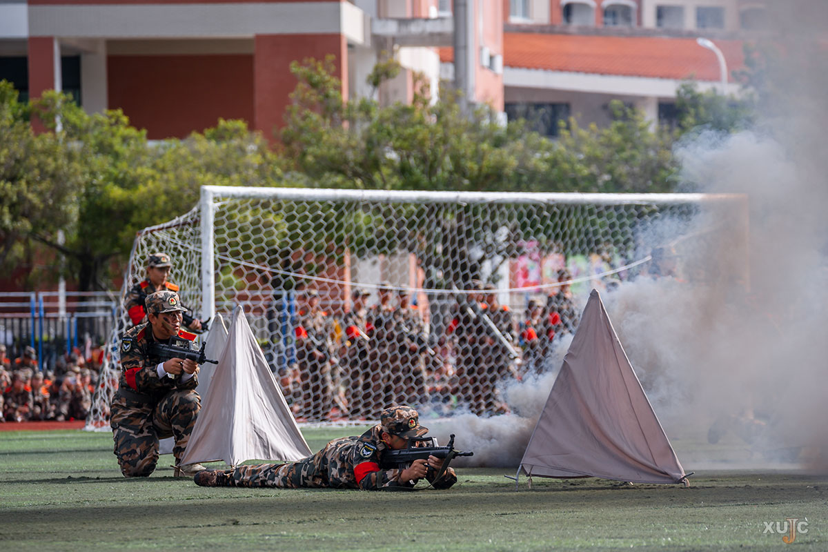 在一小時的軍訓(xùn)課目匯演中,“嘉園”學(xué)子依次表演了活字表演、匕首操、捕俘拳、刺殺操、軍體拳、旗語和戰(zhàn)術(shù)對抗演練。