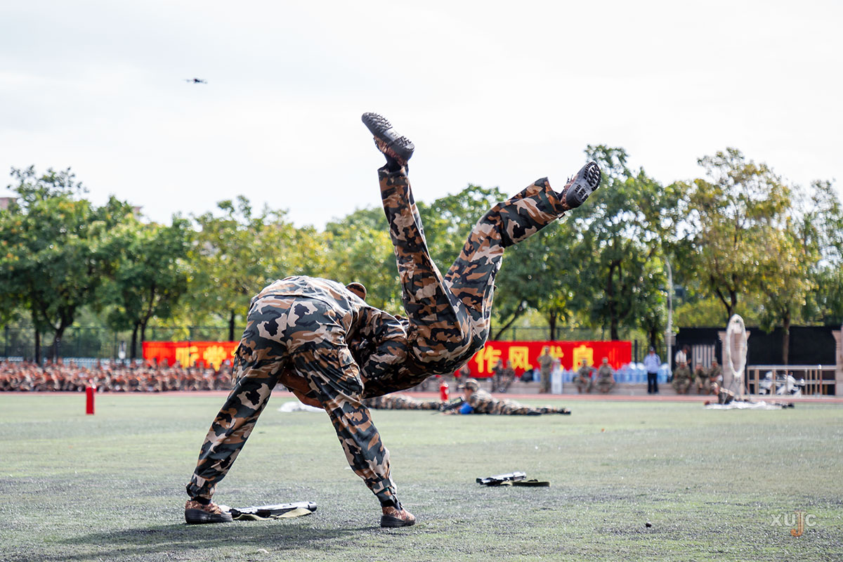 一聲“殺!”,威震四方。四營軍體拳方陣出拳氣勢如虹,踢腿凌厲有力。他們風(fēng)檣陣馬,勢如霹靂,展現(xiàn)出嘉庚學(xué)子的自強不息與挺膺擔(dān)當(dāng)。