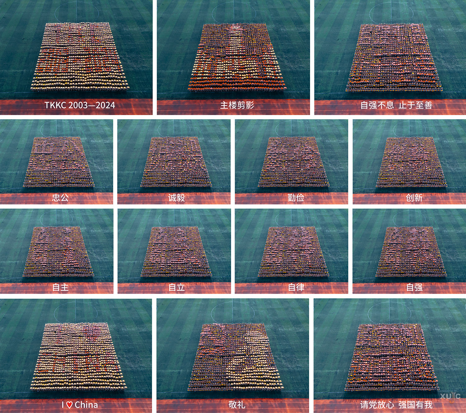 “I?CHINA”“自強不息”“止于至善”……田徑場上,千余名“嘉園”學(xué)子用“活字印刷”表演,獻禮祖國75歲華誕和校主陳嘉庚先生150周年誕辰。“2003—2024”,“TKKC”(廈門大學(xué)嘉庚學(xué)院英文縮寫)這所不一樣的大學(xué)一路蓬勃發(fā)展;隨著方陣的變換,主樓的剪影在綠茵場上徐徐展開,它見證了學(xué)校的發(fā)展歷程,也激勵著每一位學(xué)子秉持“自強不息、止于至善”與“忠公、誠毅、勤儉、創(chuàng)新”的精神,努力追求“自主、自律、自立、自強”的生活;向黨徽“敬禮”、“I?CHINA”、“請黨放心,強國有我”,訴說著新“嘉”人們熱愛祖國,心系家國的深情承諾與告白。