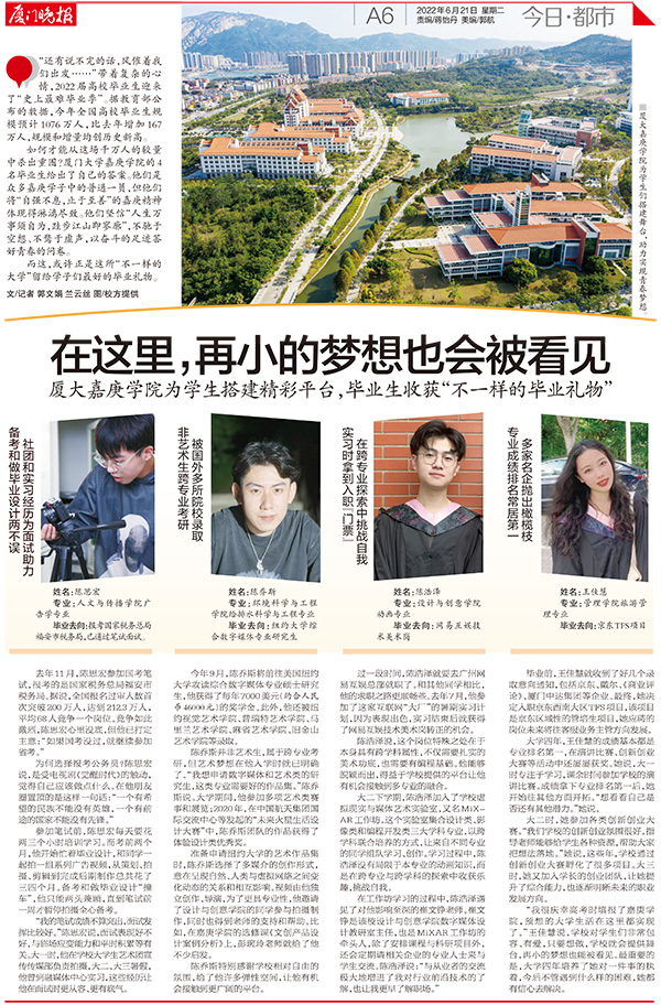 “我很慶幸高考時填報了嘉庚學(xué)院,預(yù)想的大學(xué)生活在這里都實現(xiàn)了。”王佳慧說,學(xué)校對學(xué)生們非常包容、有愛,只要想做,學(xué)校就會提供舞臺,再小的夢想也能被看見。最重要的是,大學(xué)四年培養(yǎng)了她對一件事的執(zhí)著,今后不管遇到什么樣的困難,她都有信心去解決。
