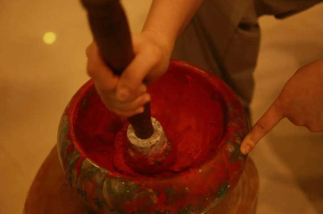 在傳統(tǒng)制作工坊內,實踐隊員們近距離觀摩了八寶印泥的制作過程。匠人們現(xiàn)場演示了從原料處理到成品捶打的全過程,其中最關鍵的是對原料配比的精準把控和數(shù)萬次的人工捶打。工作人員強調,印泥的養(yǎng)護也大有講究:使用前后都需要用配套工具沿容器邊緣上下翻挑,切忌順時針或逆時針攪拌,以免破壞內部纖維結構;即使不常使用,每半年也需翻動一次,這樣才能保持印泥內部組織均勻,延長使用壽命。這些傳承數(shù)百年的使用智慧,正是八寶印泥這項非物質文化遺產歷久彌新的重要保障。