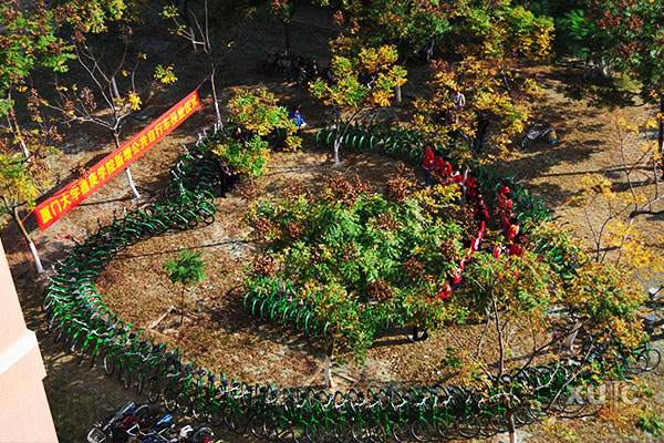 21日上午,陽(yáng)光燦爛。我院青年志愿者臉上的笑容比陽(yáng)光還要燦爛,他們一早就將300輛小綠擺成了一個(gè)很有愛(ài)的“心”型。青年志愿者隊(duì)的一位志愿者說(shuō):“希望大家也都用一顆愛(ài)心來(lái)呵護(hù)小綠。”