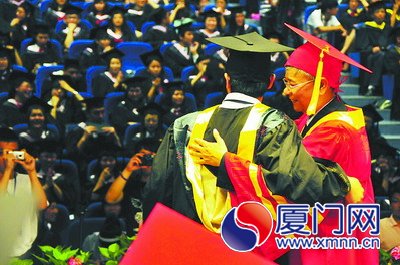 廈大嘉庚學(xué)院的畢業(yè)典禮上,院長王瑞芳和畢業(yè)生深情相擁。(朱鮮艷 攝)