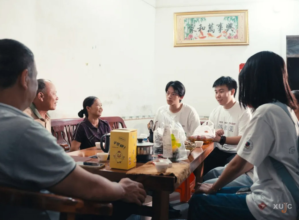 團(tuán)隊(duì)穿行于青石板路,在承載家族記憶的宗祠、歷經(jīng)滄桑的百年老宅、宗祠,與濃蔭蔽日的古樹下,觸摸村莊的歷史脈絡(luò)。夜幕中,師生與村民圍坐暢談,傾聽塵封往事。鄉(xiāng)親們熱情端上自種花生、香醇米酒和當(dāng)?shù)靥厣〕杂图寤{,歡聲笑語間流淌著濃濃鄉(xiāng)情,活動在溫馨合影中定格。