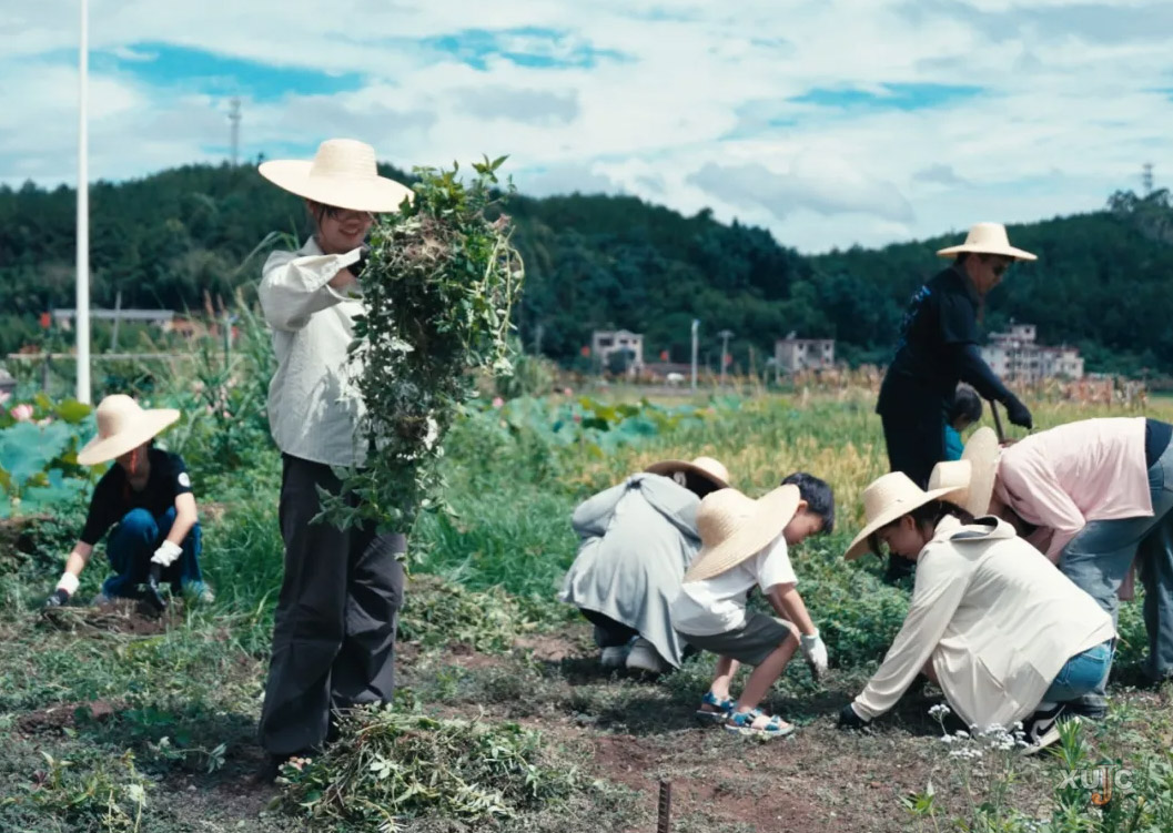7月20日,團(tuán)隊(duì)一行戴好草帽、防護(hù)手套,踏著濕潤的田埂走向吳氏圍龍屋旁邊的閑置地塊開展改造工作。大家分工合作,男生掄起鋤頭,女生俯身拔草,共同完成著這份特殊的“小組作業(yè)”。