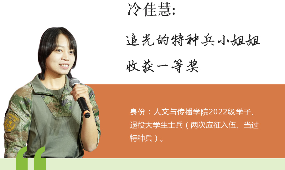 2024年12月20日,在第八屆“愛我國(guó)防”福建省大學(xué)生演講比賽中,冷佳慧憑借97.50的高分榮獲省賽一等獎(jiǎng)。她以“追光”為題,深情講述自己二次入伍、四年義務(wù)兵的軍旅生涯以及追尋光、成為光、散發(fā)光的精彩故事。退役復(fù)學(xué)后,她通過分享軍旅故事,參加“愛我國(guó)防”演講比賽、編導(dǎo)國(guó)防情景劇,用自己的微光照亮更多青年一起關(guān)心國(guó)防、支持國(guó)防、愛我國(guó)防。值得一提的是,她還編導(dǎo)和主演了廈門大學(xué)嘉庚學(xué)院人文與傳播學(xué)院音頻研究與創(chuàng)作中心原創(chuàng)制作的沉浸式聲音劇《赴戎機(jī)》,該劇在閩南大戲院小劇場(chǎng)上演。