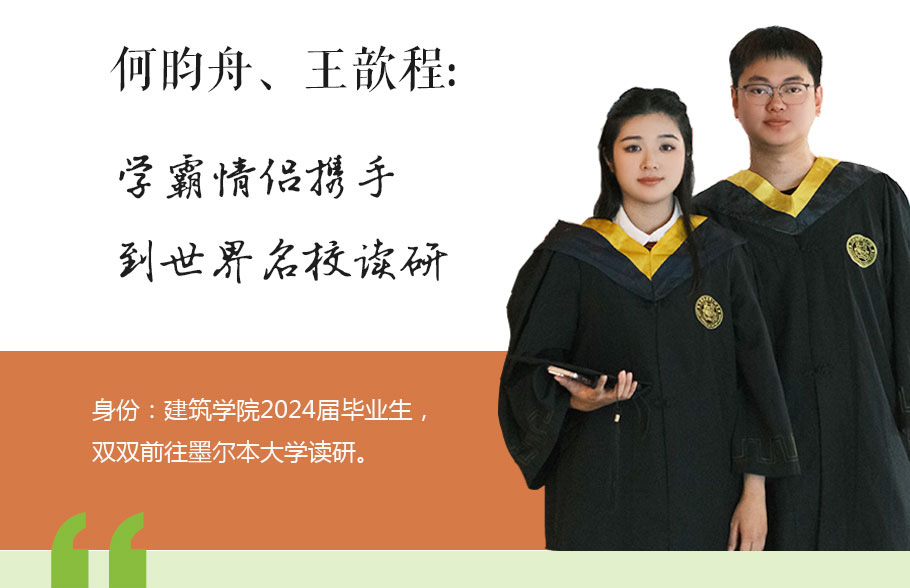建筑學(xué)院2024屆畢業(yè)生何昀舟與王歆程的故事,是一段緣起于“嘉園”,最終攜手逐夢(mèng)世界名校的佳話。大一時(shí),還不相識(shí)的兩人各自做出出國(guó)留學(xué)的決定。談戀愛后,兩人更是基于這個(gè)共同目標(biāo),一同奮斗。他們?nèi)σ愿?,確保每門課程取得好成績(jī),以累積足夠的績(jī)點(diǎn)達(dá)到申請(qǐng)學(xué)校的要求,并出色地完成自己的建筑設(shè)計(jì)作品集。他們的努力結(jié)出了碩果——多個(gè)offer如約而至。綜合考慮了專業(yè)、城市、費(fèi)用和未來規(guī)劃,他們最后選擇了墨爾本大學(xué)。