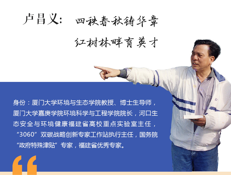 從教47年來,盧昌義深耕于紅樹林生態(tài)系統(tǒng)保護(hù)修復(fù)研究。他親自設(shè)計(jì)、建設(shè)多項(xiàng)紅樹林生態(tài)修復(fù)重點(diǎn)工程,把論文寫在祖國(guó)的大地上。自2005年擔(dān)任我校環(huán)境科學(xué)與工程系(現(xiàn)為環(huán)境科學(xué)與工程學(xué)院)主任以來,他帶領(lǐng)我校教師團(tuán)隊(duì)獲國(guó)家一流課程1門、省級(jí)一流課程8門、3次省級(jí)教學(xué)成果獎(jiǎng)。他用自己橫向項(xiàng)目結(jié)余的經(jīng)費(fèi)(100萬)設(shè)立了“環(huán)境科學(xué)發(fā)展基金”,專門資助環(huán)境科學(xué)與工程學(xué)院青年老師的發(fā)展。他還是我校“公益獎(jiǎng)學(xué)金”和“孝敬長(zhǎng)輩獎(jiǎng)勵(lì)基金”的創(chuàng)立者和主要捐贈(zèng)者,并為我校捐贈(zèng)了41萬元,用于校園綠化等工作。他也是學(xué)校首屆杰出貢獻(xiàn)獎(jiǎng)獲得者,獎(jiǎng)金10萬元全部捐給廈門大學(xué)馬來西亞分校。