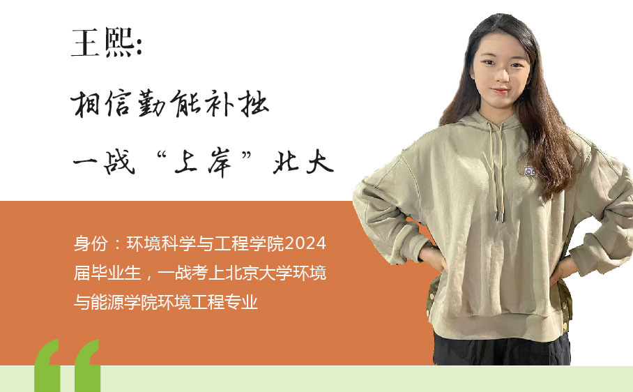 在2024年的全國(guó)碩士研究生統(tǒng)一招生考試中,環(huán)境科學(xué)與工程學(xué)院2020級(jí)學(xué)子王熙被北京大學(xué)環(huán)境工程專業(yè)錄取。都說考研是一段孤獨(dú)的旅程,但讓王熙慶幸的是,這一路上有不少良師益友的相伴。她說:“真的很感謝環(huán)境科學(xué)與工程學(xué)院院長(zhǎng)盧昌義教授和老師們,他們一直為學(xué)生們保駕護(hù)航。在我迷茫的時(shí)候,他們耐心地傾聽,為我指點(diǎn)迷津。”