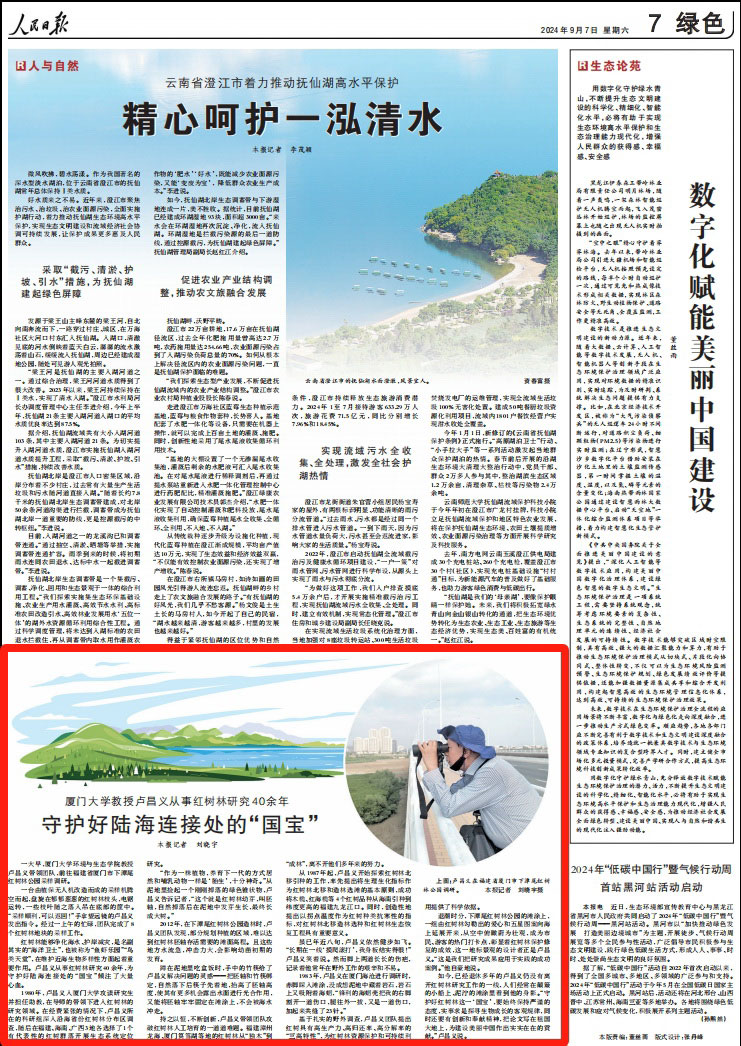 9月7日,《人民日?qǐng)?bào)》綠色版刊發(fā)通訊《守護(hù)好陸海連接處的“國(guó)寶”》,聚焦廈門大學(xué)教授盧昌義從事紅樹林研究40余年,把論文寫在祖國(guó)大地上,為建設(shè)美麗中國(guó)作出貢獻(xiàn)。
