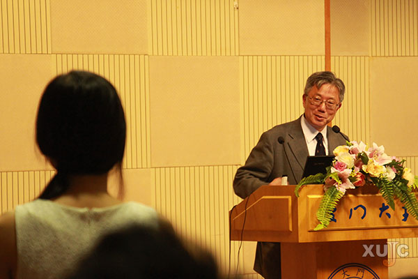 講座開始,木村勝彥用中文向大家道了聲“你好”,引得陣陣掌聲和歡笑。木村勝彥還對嘉庚學(xué)院送上了校慶祝福:“在此,我想對廈門大學(xué)嘉庚學(xué)院表示深切的祝福與感謝,祝福廈門大學(xué)嘉庚學(xué)院十周年生日快樂。”日語系老師徐家瑤充當了他的翻譯。