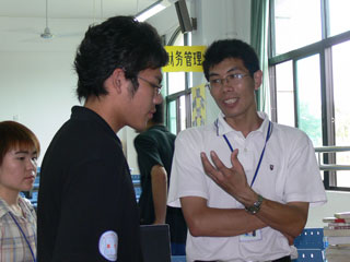 管理系代主任史繼坤與考生及家長親切交流 | 管理系行政秘書兼輔導(dǎo)員趙小彬耐心介紹本系情況 |