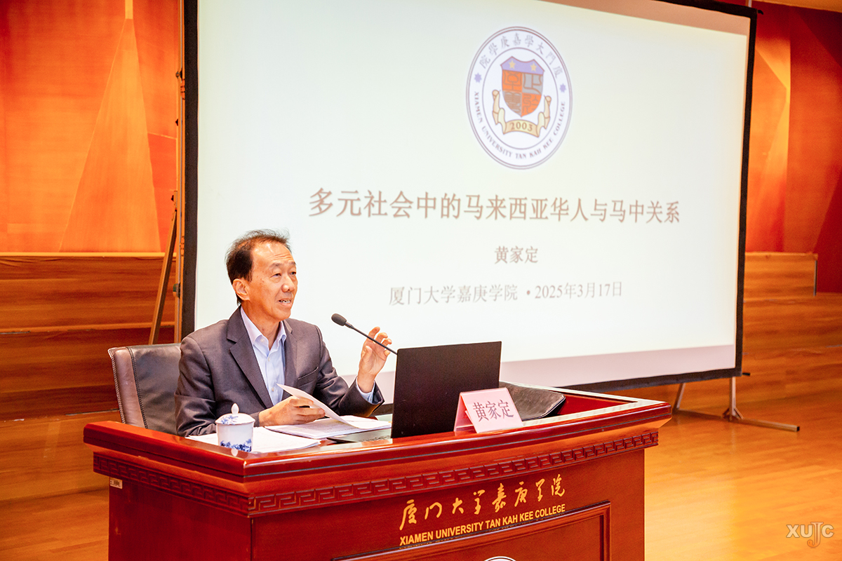 馬來西亞丹斯里黃家定是廈門大學(xué)南洋研究院/國(guó)際關(guān)系學(xué)院講座教授、客座教授,曾任馬來西亞首相對(duì)華特使、馬來西亞-中國(guó)商務(wù)理事會(huì)主席、馬來西亞國(guó)會(huì)議員、馬來西亞房屋及地方政府部長(zhǎng)、馬來西亞華人公會(huì)總會(huì)長(zhǎng)等重要職務(wù)。在主持講座時(shí),王瑞芳院長(zhǎng)著重介紹了主講人的成就。他強(qiáng)調(diào),黃家定教授在促進(jìn)馬中友好關(guān)系以及推動(dòng)馬來西亞華人社會(huì)發(fā)展方面做出了突出的貢獻(xiàn),特別是在協(xié)助促成廈門大學(xué)在馬來西亞建立分校方面不遺余力。他代表學(xué)校和全體師生對(duì)黃家定教授的蒞臨,表示誠(chéng)摯的歡迎和衷心的感謝。