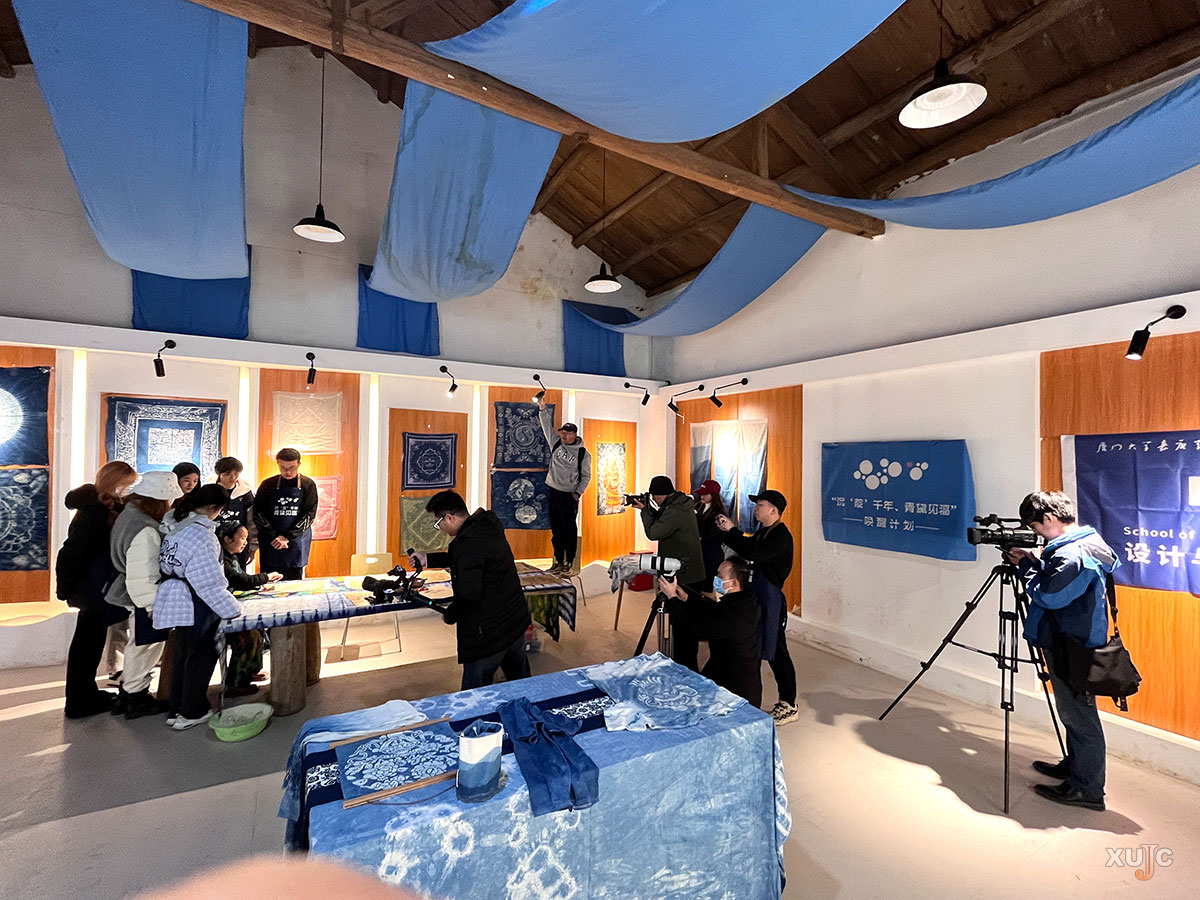 實踐隊走訪調(diào)研了四黃村青黛種植區(qū),參觀藍靛池農(nóng)業(yè)生產(chǎn)遺址,跟隨青黛工藝非遺傳承人黃碧紅老師對鏤空印花、扎染、刮漿等青黛傳統(tǒng)印染工藝步驟進行實踐學(xué)習(xí),手工制作藍印花布及扎染原創(chuàng)手工作品。同時,實踐隊還對數(shù)百幅青黛藍染作品進行了影像采集、數(shù)據(jù)處理以及數(shù)字化轉(zhuǎn)化,建立了作品數(shù)據(jù)庫,為傳統(tǒng)青黛印染工藝文化的整理與保存工作提供了科技力量支撐與創(chuàng)新創(chuàng)意新動能。此外,實踐隊策劃舉辦了仙游主題青黛非遺工藝文化創(chuàng)新展覽和“靛·藍·澗”書峰藍印花布印染復(fù)原場景藝術(shù)展,多方位展示了60余幅精美的傳統(tǒng)工藝藍印花布作品和180余件團隊青黛印染創(chuàng)意作品,并拍攝青黛文化宣傳片,為青黛印染傳播奠定了堅實的基礎(chǔ),為年輕人關(guān)注家鄉(xiāng)現(xiàn)狀、回歸鄉(xiāng)村建設(shè)提供了模式示范。