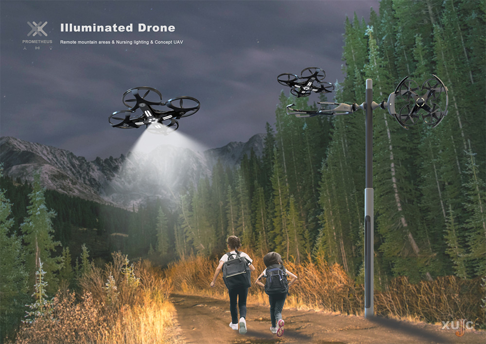 我校獲獎作品名為《Illuminated Drone》,是一款針對偏遠山區(qū)學生走夜路的護學照明概念無人機。Illuminated一詞譯為發(fā)光的,而大家更喜歡叫這項設計為“溫柔無人機”。據(jù)設計者馮鎮(zhèn)浩介紹,這件作品起心于“照亮山區(qū)孩童上學路”的初衷。另一位設計者鄧依婷說:“Illuminated是這款產(chǎn)品的主題體現(xiàn),‘溫柔無人機’大概是因為無人機為學生照亮了前方的路,顯得格外溫柔。‘溫柔’也體現(xiàn)了我們產(chǎn)品設計中對山區(qū)學生的關懷。”