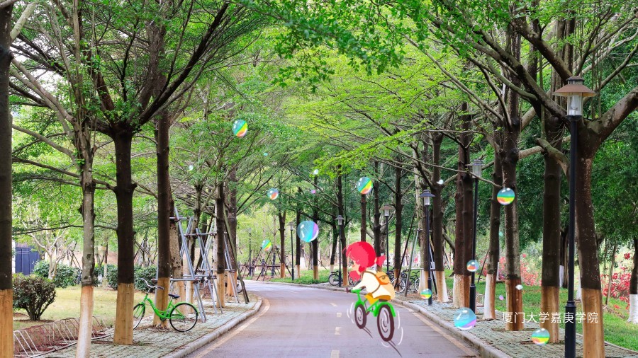樹木換上滿身的綠,女孩騎著單車,肩上的馬尾一蹦一跳,甚是可愛。