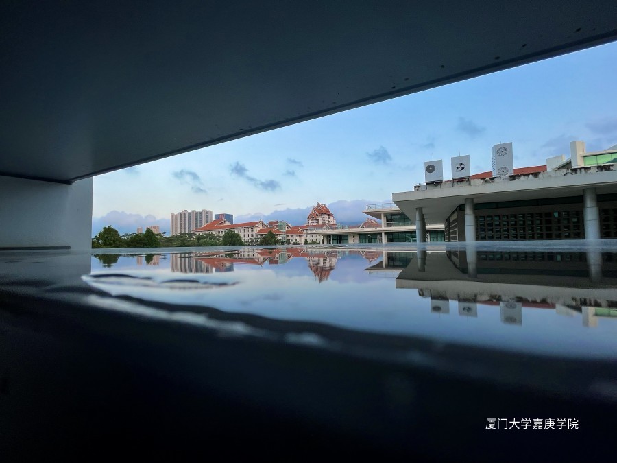 下完雨的嘉庚學院,欄桿上灌滿了水,天空上飄著零零散散的云,給通透的天空增加了幾分點綴;