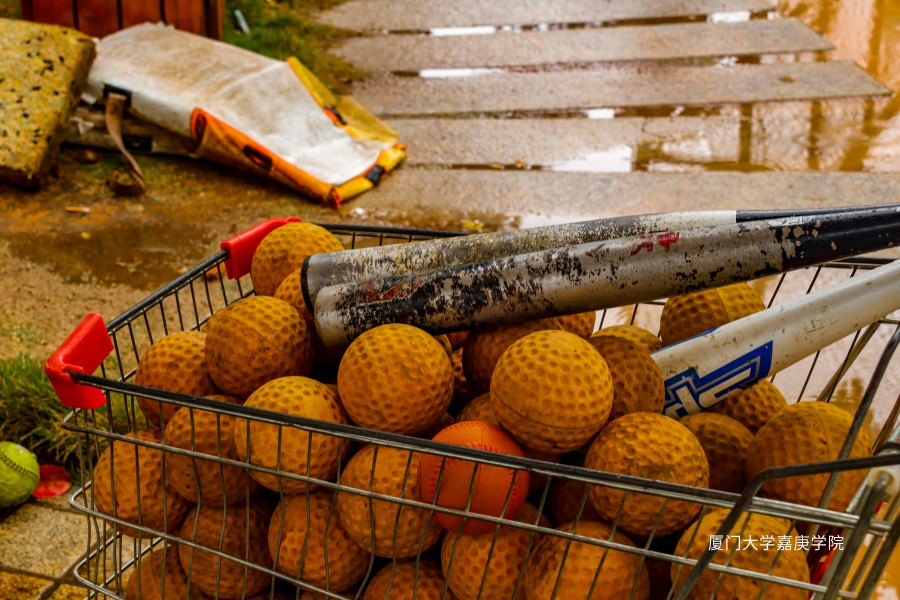 金屬籃、舊球棍、黃棒球、磨損、潮濕,還原生活本真,傳遞運動余韻。
