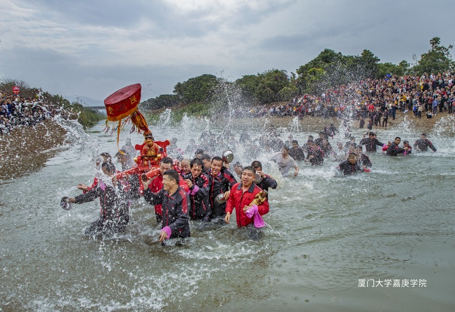 在正月十五的中午,林前村的村民們陸陸續(xù)續(xù)朝河邊集結(jié),抬神的村民們將伽藍(lán)王神像抬至村頭賜霖溪畔,在岸上焚香祭拜后,村民們開始抬著神像沿河邊的小路沖進(jìn)河中,緩緩的渡過河流,抬向?qū)Π丁?/p>