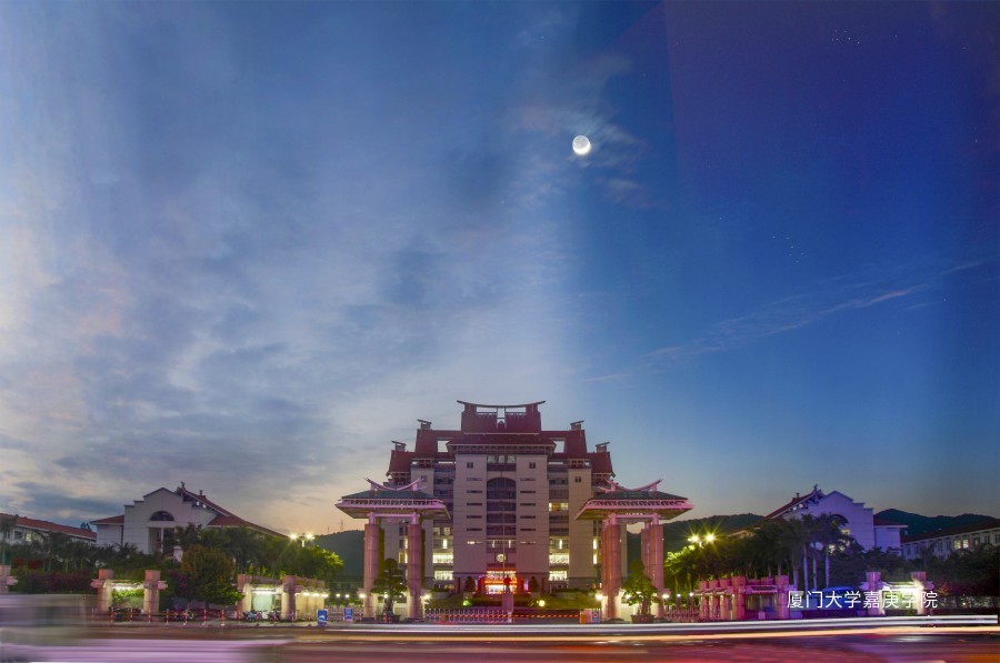 主三正門,下午17:10-19:30,左→右,日落到天黑。黃昏時(shí)刻,夕陽(yáng)從后面落下留下一絲昏黃的余暉,而前面的天空卻在淺藍(lán)到深藍(lán)中不斷變換,配上那六點(diǎn)之時(shí)出現(xiàn)的偏月石,給嘉園添上一抹神秘之感,如童話般夢(mèng)幻。