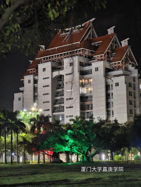 夜晚的嘉庚主樓,在燈光映照下,紅頂白墻的嘉庚建筑風(fēng)格盡顯。樓前綠樹被彩燈點(diǎn)亮,光影交錯(cuò),營造出夢幻氛圍。這里是知識(shí)殿堂,夜晚依舊有學(xué)子在樓內(nèi)鉆研學(xué)業(yè)。夜影中的嘉庚主樓,似一位守護(hù)者,見證著無數(shù)求知者的奮斗,也訴說著校園的厚重底蘊(yùn)。
