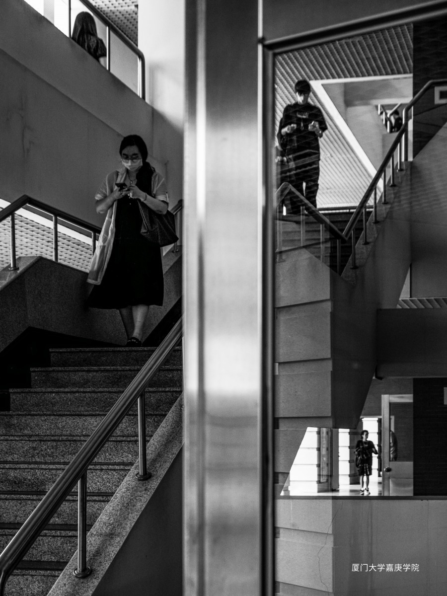 利用復(fù)雜的框式構(gòu)圖,靜靜等待下課的人們