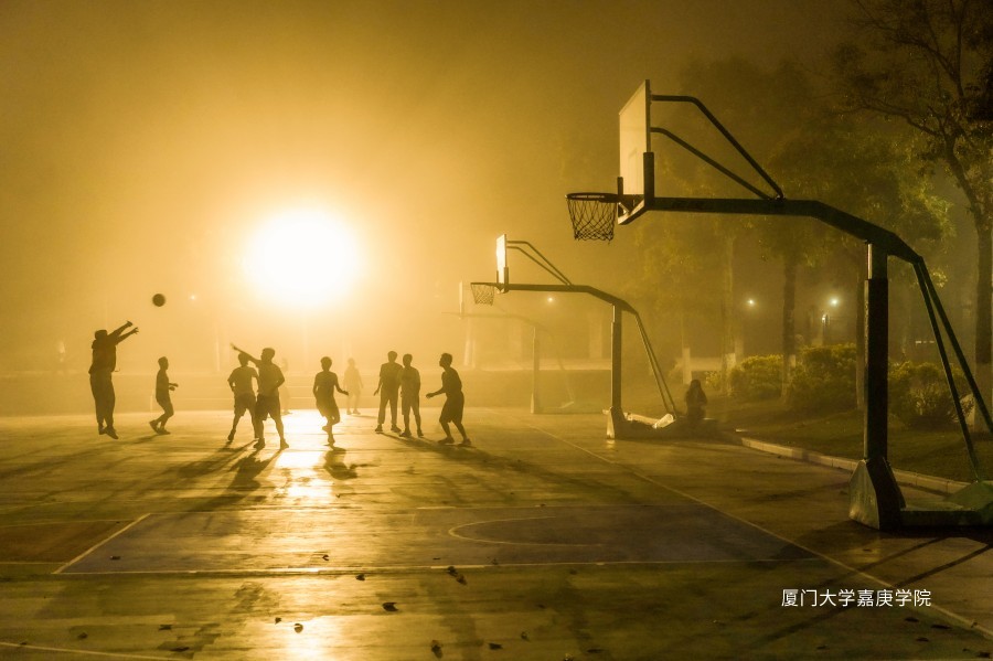 今日嘉庚學(xué)院霧氣重重,如同迷霧圣境。籃球場上有不少同學(xué)在運動,快看,有人投籃了!