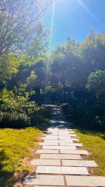 石板小徑蜿蜒林間,見證著嘉庚學(xué)子步履匆匆,瞻前顧后。陽光透過樹葉的縫隙,灑下斑駁光影,生機勃勃,盈滿晴朗。每走在這條棲霞湖邊小徑上,心中總是充滿希望,仿佛一切美好向我走來。戴上耳機,周杰倫的《晴天》前奏響起時,知了熱烈的叫聲竟比鼓點還重。