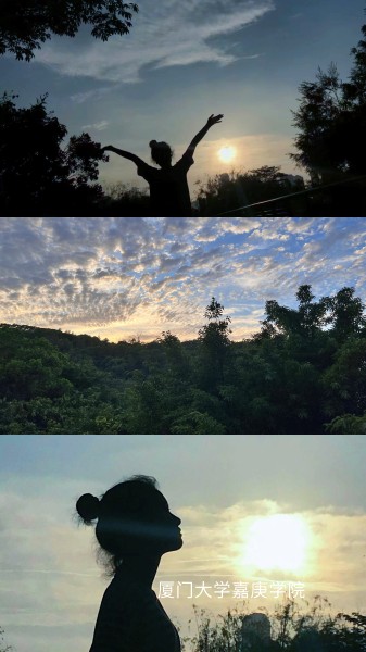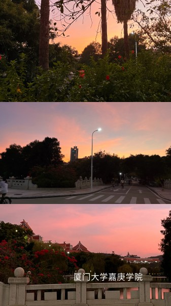 走過許多城市的黃昏,卻無法遇見這般濃烈的晚霞?;蛟S青春本就是場盛大的光學(xué)現(xiàn)象,與校園落日同時成為無法復(fù)刻的絕版?;椟S跳動的路燈,騎行少年經(jīng)過時帶起的風(fēng),看夕照將嘉園染成暖金色,余暉灑落校園小道,寧靜而美好。嘉庚學(xué)生的笑聲、嘆息、汗水、淚水都將融入這片暮色,成為青春最動人的注腳,也是這幅晚霞畫卷中不可或缺的一筆。