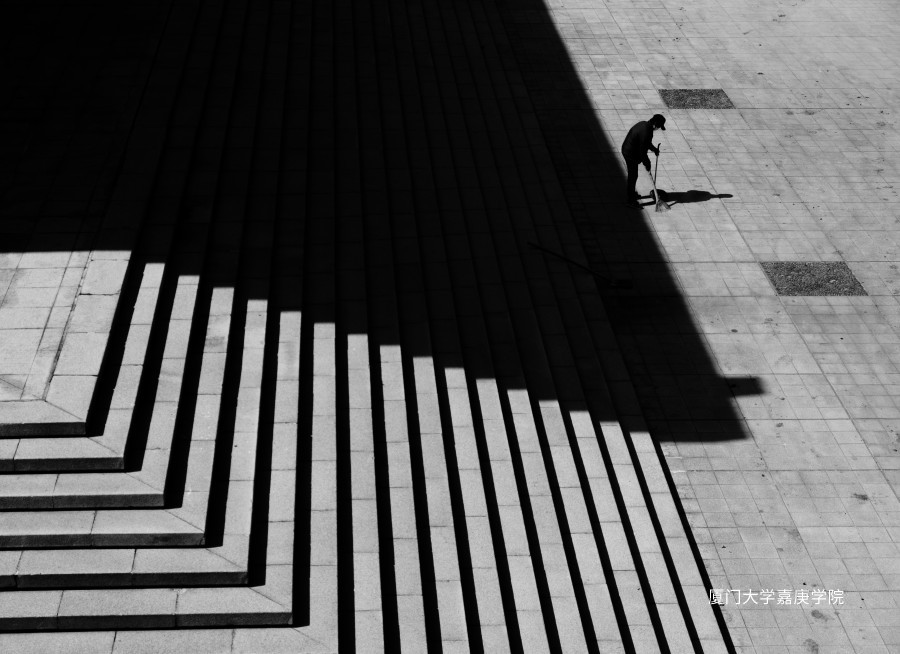 通過大面積的光比留白與人物形成點面對比關(guān)系,人是一“點”,畫面大量光比可謂生活,則為一“滴”,渲染清潔工平凡的人生的點點滴滴。