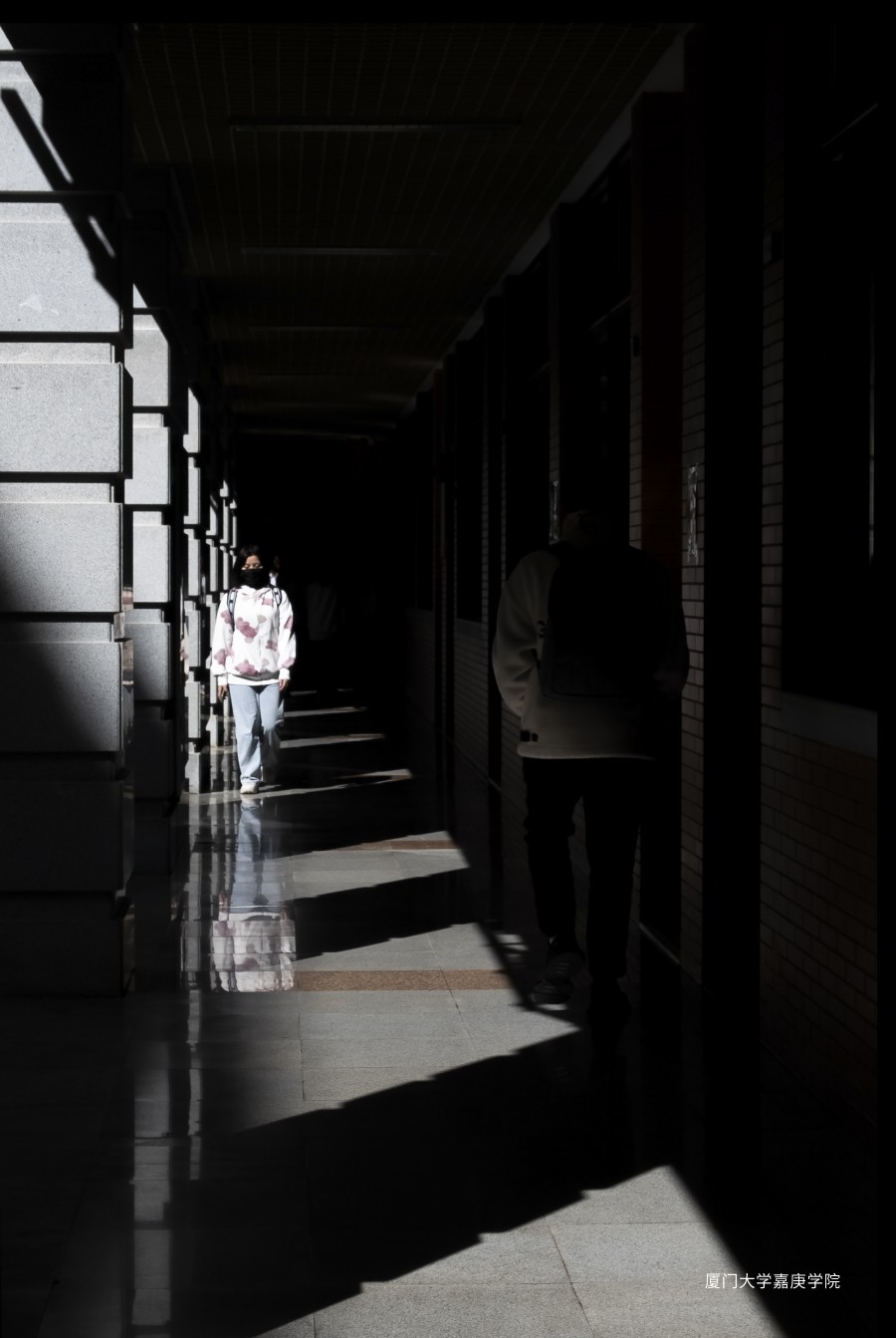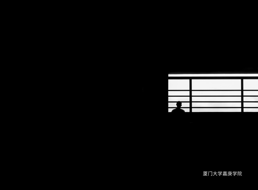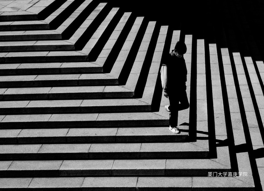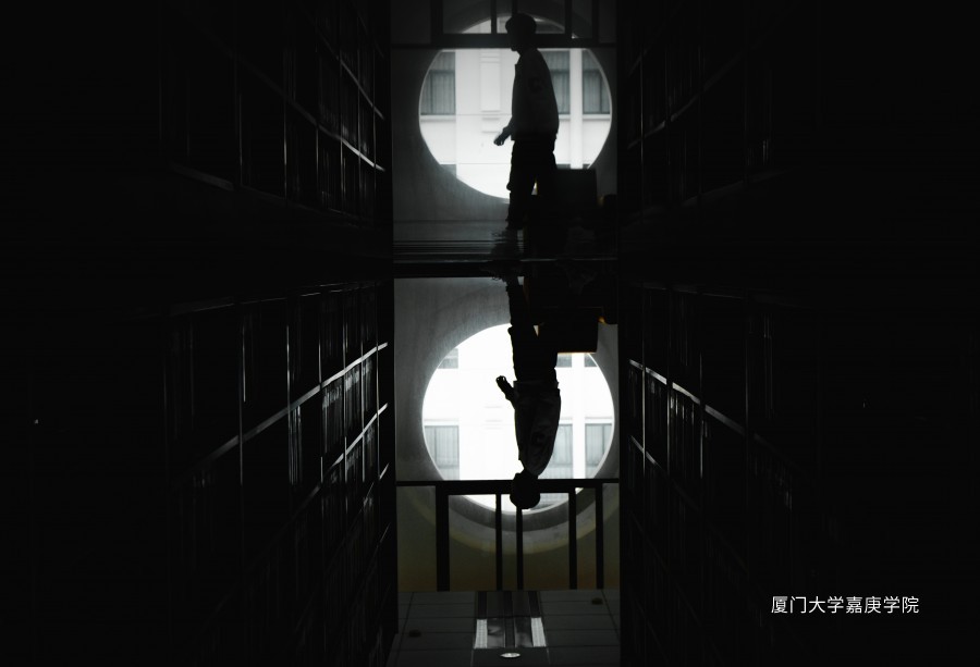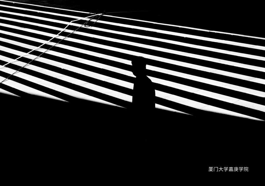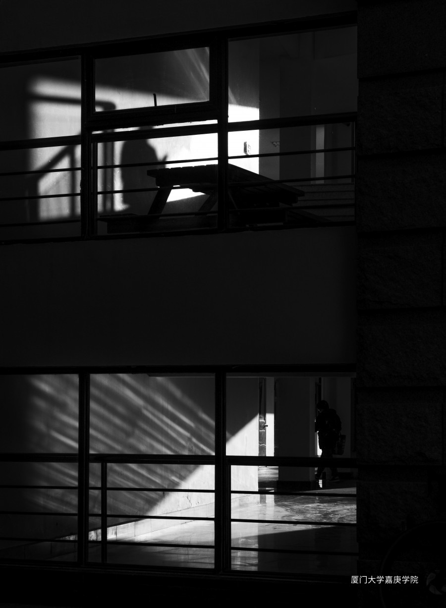 下午時刻,公共大樓的扶手欄桿在陽光的投射下形成剪影效果,此時正好有一位學生出現(xiàn)在光線明亮的區(qū)域,這幅“窗戶”里的人物剪影給人們留下更多的想象空間。