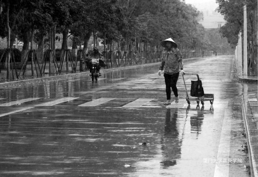 雨中漫步的身影是辛勤勞動(dòng)的人們,他們身軀雖不高大,但精神可貴,嘉園因他們的存在而頓增生機(jī)勃勃的昂揚(yáng)氣色。