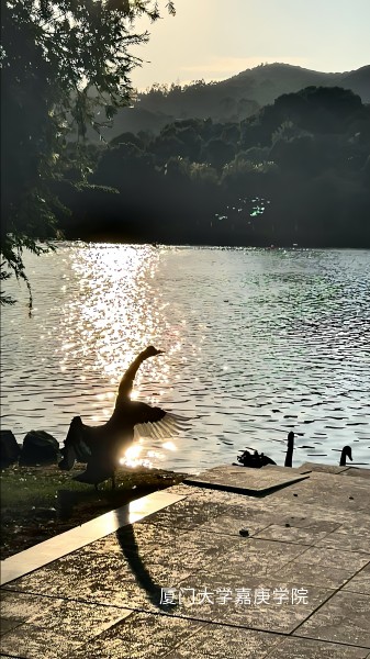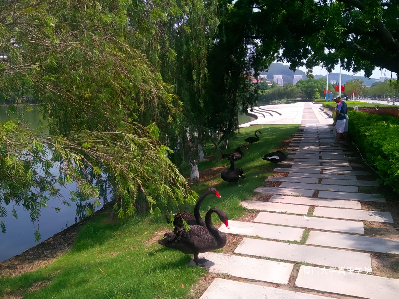 校園湖畔黑天鵝,藍衫靜賞景中留。