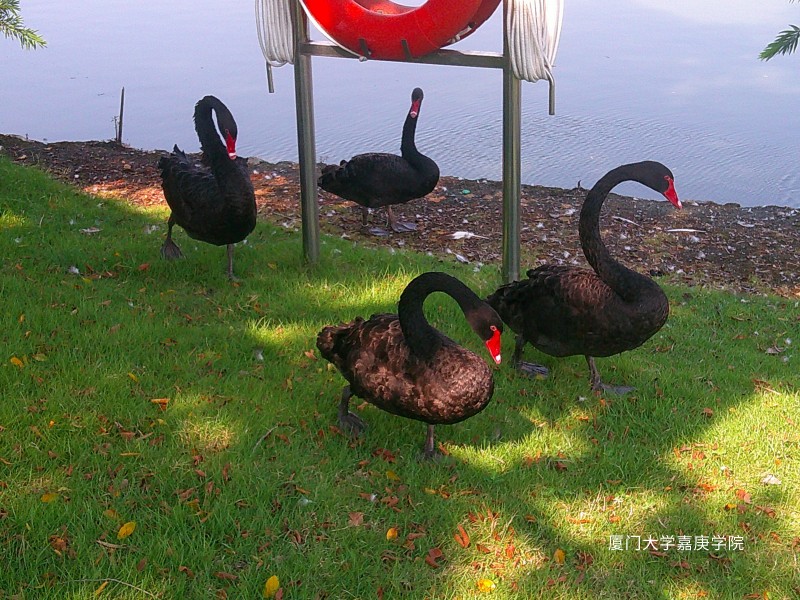 棲霞凌波映黑鵝,靜享湖畔好時光。