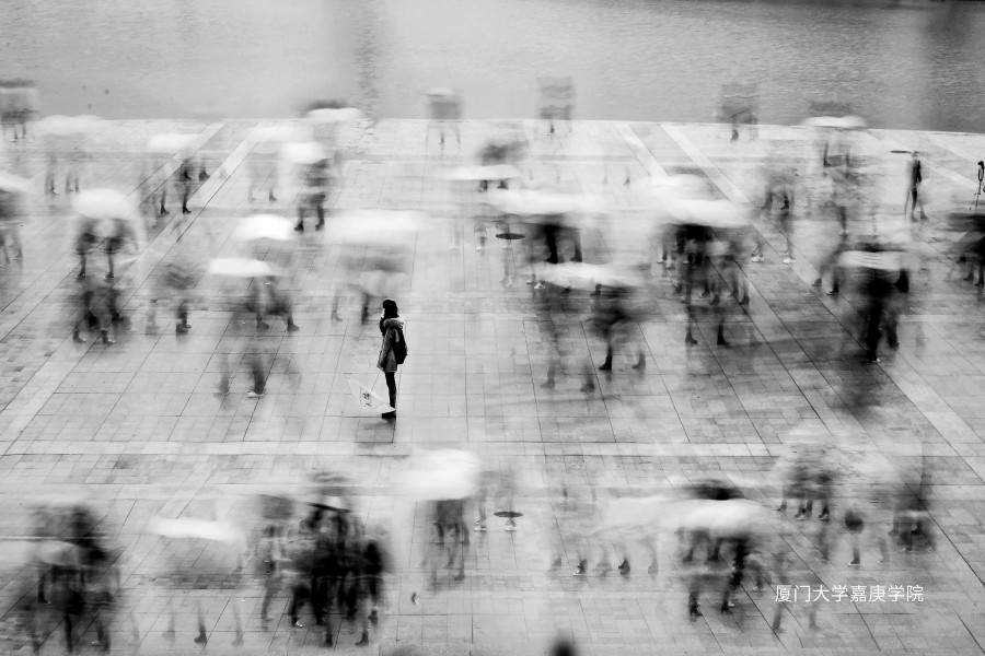 下課人流高峰時(shí)在圖書館門前獨(dú)自等待的行人。