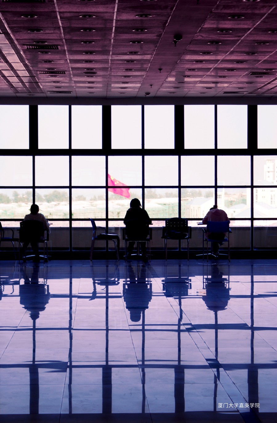 圖書館一側(cè),窗外的國旗與讀書的學(xué)生產(chǎn)生有趣的聯(lián)系。
