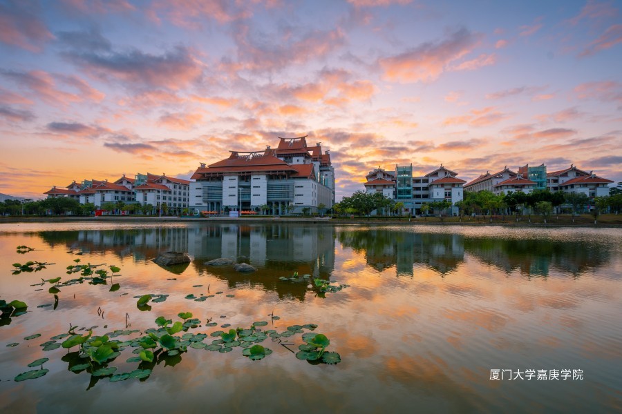 清晨時的廈門大學嘉庚學院,日出下的棲霞湖風光美好