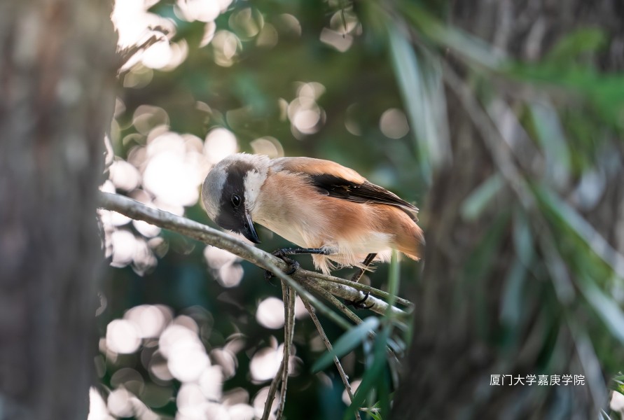 伯勞鳥在湖畔的樹上伺機出動,偶爾看見它在湖畔吃著小魚