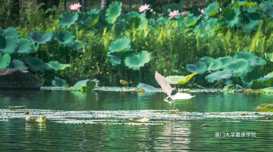 拍攝于“嘉園”荷花池地,一只飛鳥剛好展翅飛翔,與周邊荷花相襯,絕美