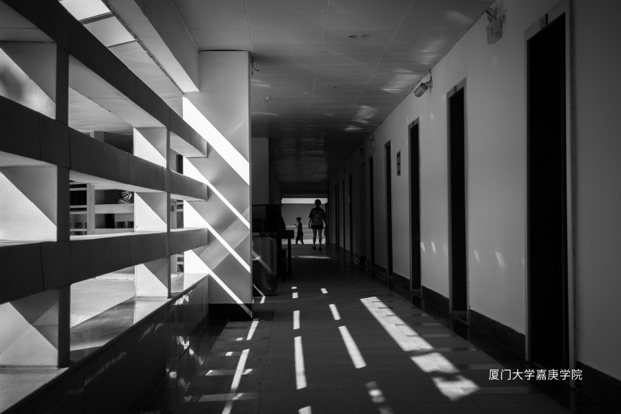 下午三點(diǎn),陽(yáng)光打在走廊,明暗對(duì)比強(qiáng)烈,光影和建筑的線條清晰。走廊深處,兩個(gè)學(xué)生路過(guò)。